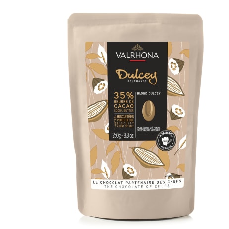 Blond Dulcey chocolate boasts an enticingly creamy texture. The intense biscuit flavor is sweet yet not too sugary and f inishes with generous notes of shortbread with a dash of salt.