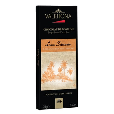 Valrhona spent 10 years researching and building a trusting relationship with the Rizek family before it bought the Loma Sotavento plantation in 2011. This old farm, whose name means ""windswept hill"" in Spanish, sits in the Maria Trinidad Sanchez region at the foot of a lush hill in northeastern Dominican Republic. Valrhona brought the Dominicans' ancient and invaluable cacao growing know-how to this farm as well as its expertise in replanting trees, selecting, fermenting and drying cacao beans. Grown without any fertilizers or pesticides, this natural cacao is permeated by flavors from neighboring fruit orchards and was chosen for its exceptional taste profile. The rarest beans are selected and sent to the chocolate factory where they are transformed into outstanding chocolate. Loma Sotavento domain chocolate is the result of this rewarding endeavor.