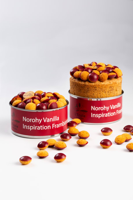 NOROHY VANILLA is brought under the spotlight in this tin. This recipe combines the strong fragrances of Vanilla, with the sharp taste and acidity of Raspberry puree, and Raspberry vinegar. A very light sponge texture based on large proportion of egg white compare to traditional travel cake. This cake is paired with the light crumbliness of shortbread and the strong fragrance of Inspiration paste.