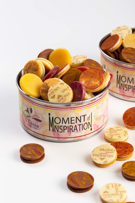 MOMENT of INSPIRATION tin, highlight new recipe based on the traditional Japanese Wagashi pastry. The creation combines the fragrances of Inspiration couverture, ganache and sable textures. The result is a paste which is less sensitive to the heat or humidity, and also less sweet than a traditional “Pate de fruit”.
