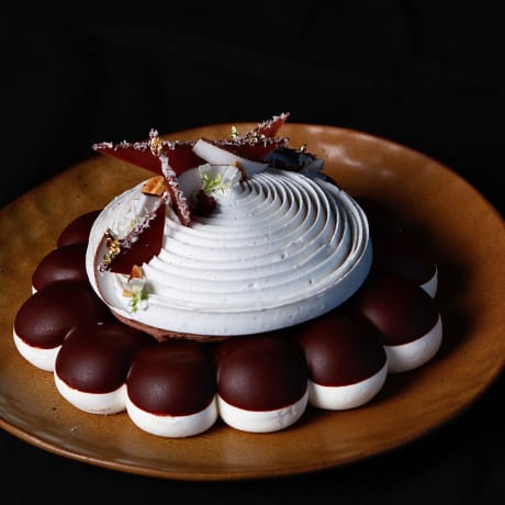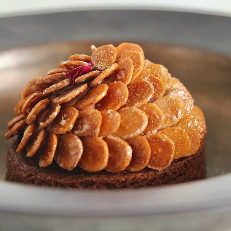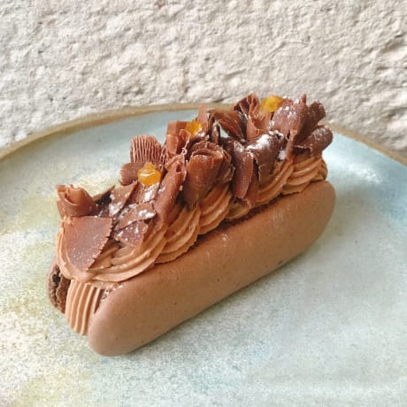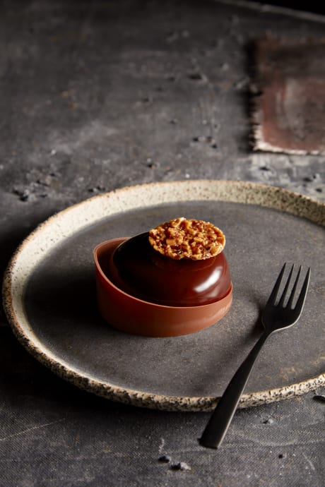 "Le Monkï" is a crispy chocolate brownie surrounded by a chocolate macaroon, all garnished with a chocolate cream with jasmine tea, covered with a ganache mounted with orange blossom and sprinkled with crunch.
